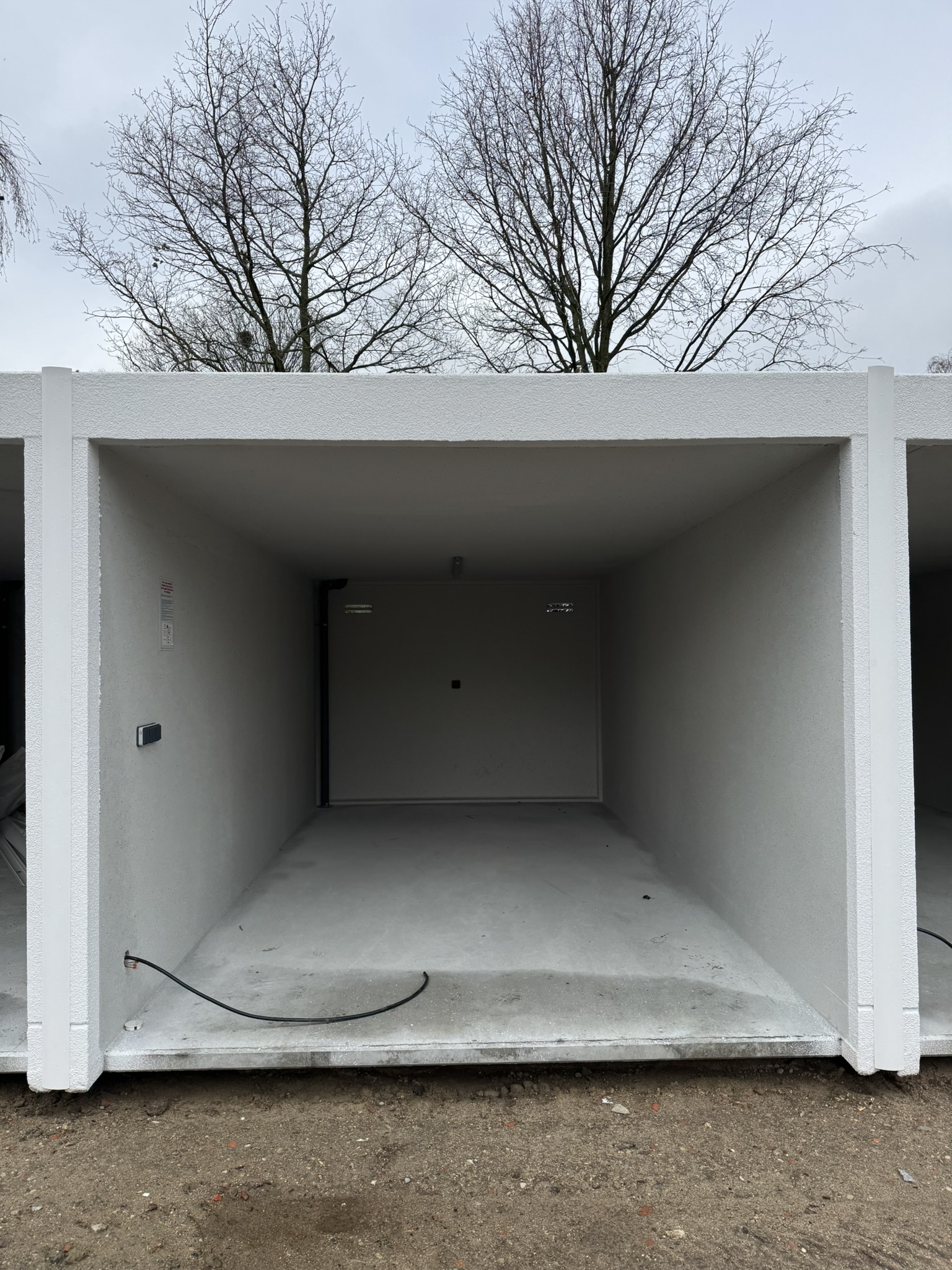 Nieuwe prefab garageboxen, uitgerust met een sectionale poort (witte uitvoering en geautomatiseerd) en volgende voorzieningen aanwezig: elektriciteit (lichtpunt en stopcontacten) en, in de gemeenschappelijke technische ruimte, water (recuperatie). Deze garageboxen worden bovendien uitgevoerd met een groen dak.