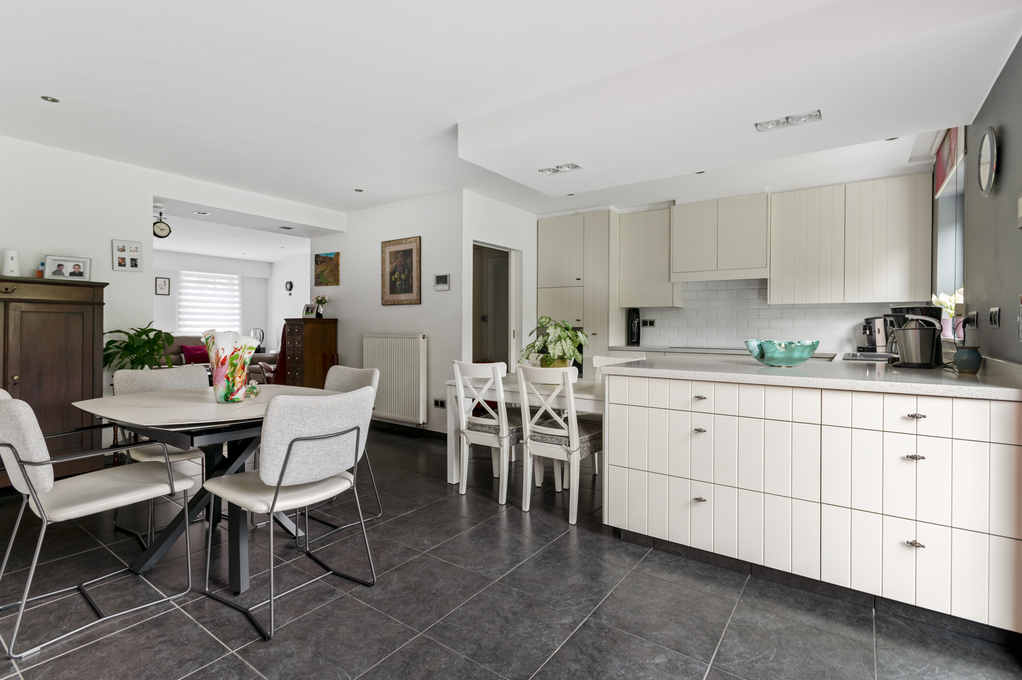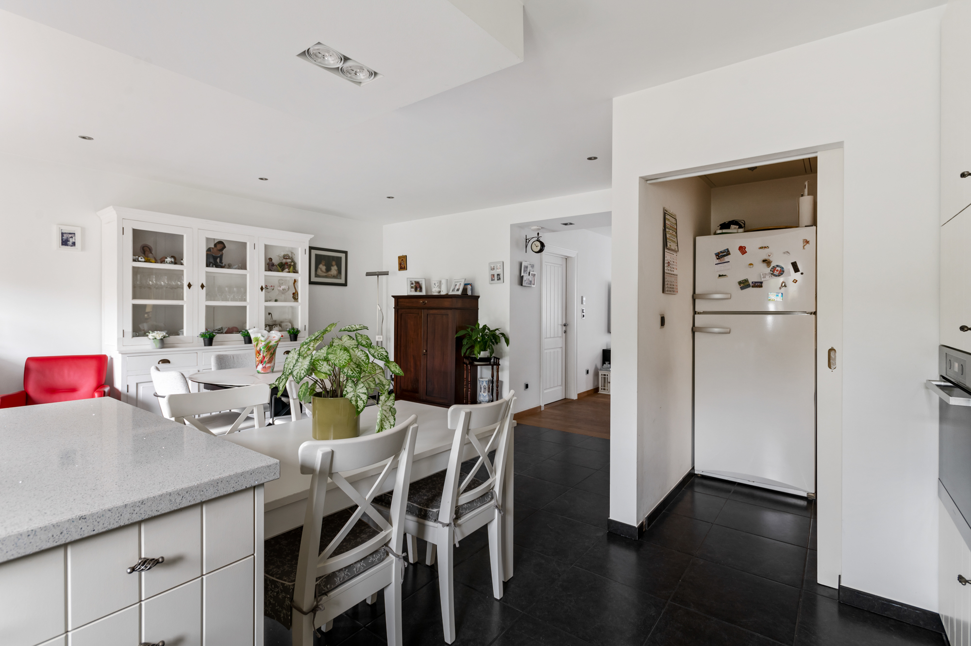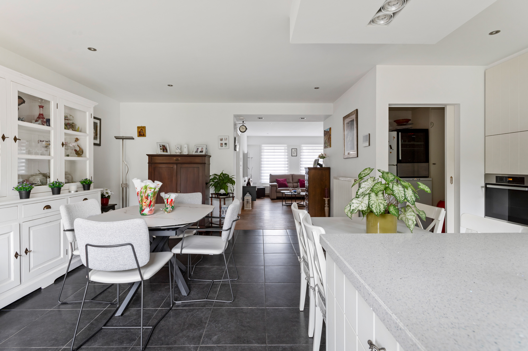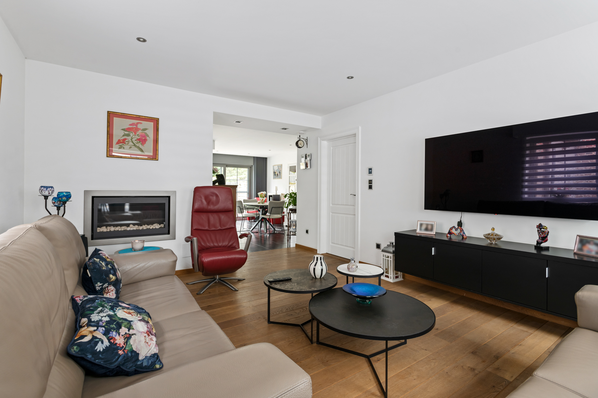 We betreden de woning langs de inkomhal met ingemaakte vestiaire- en schoenenkast en gastentoilet en komen vervolgens in de ruime, lichtrijke leefruimte (met gashaard). De leefruimte biedt U meer dan voldoende plaats voor een gezellige zithoek en een eetkamer.