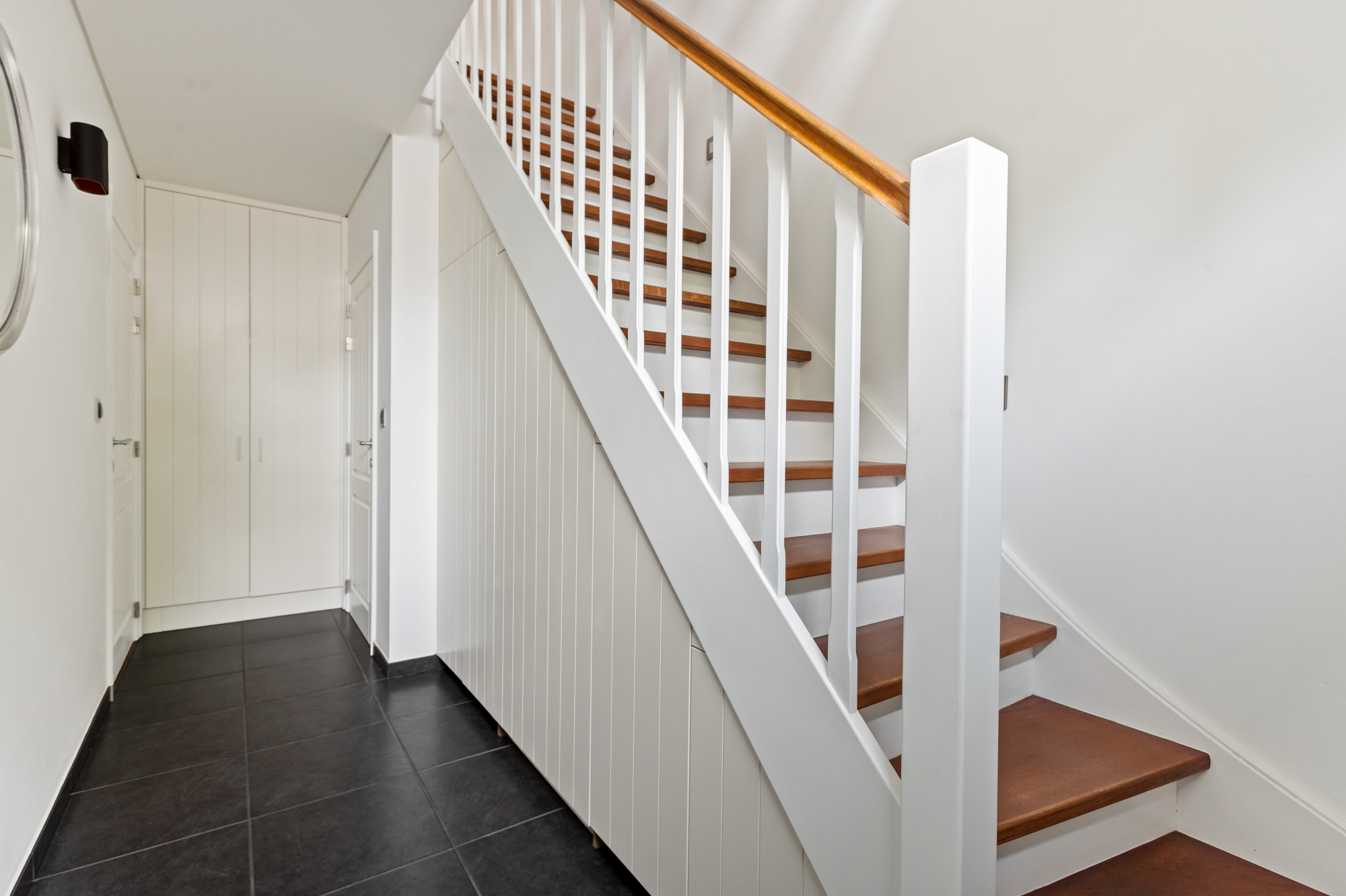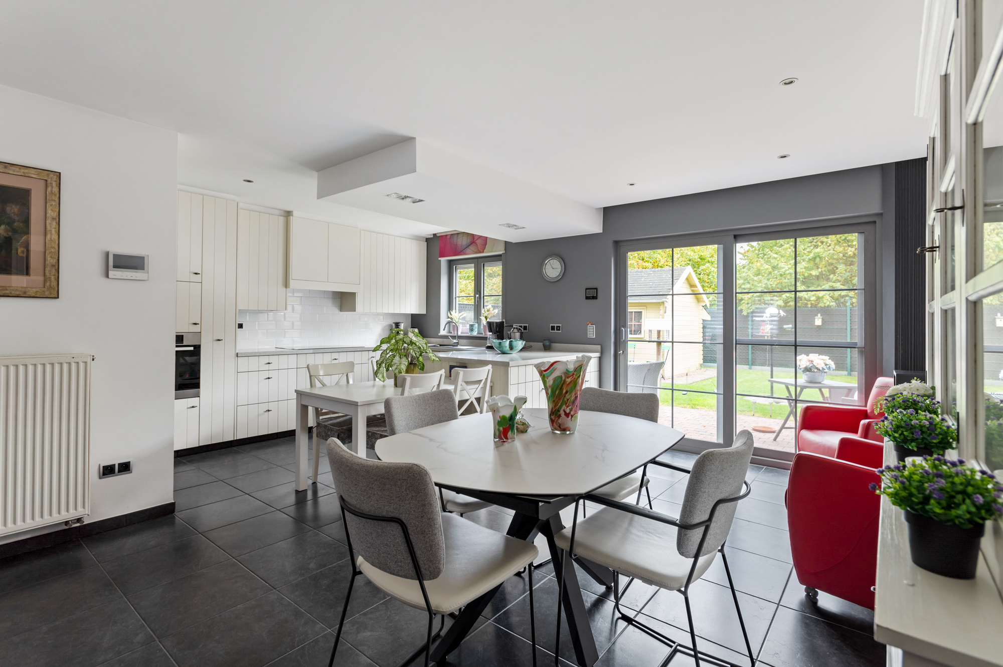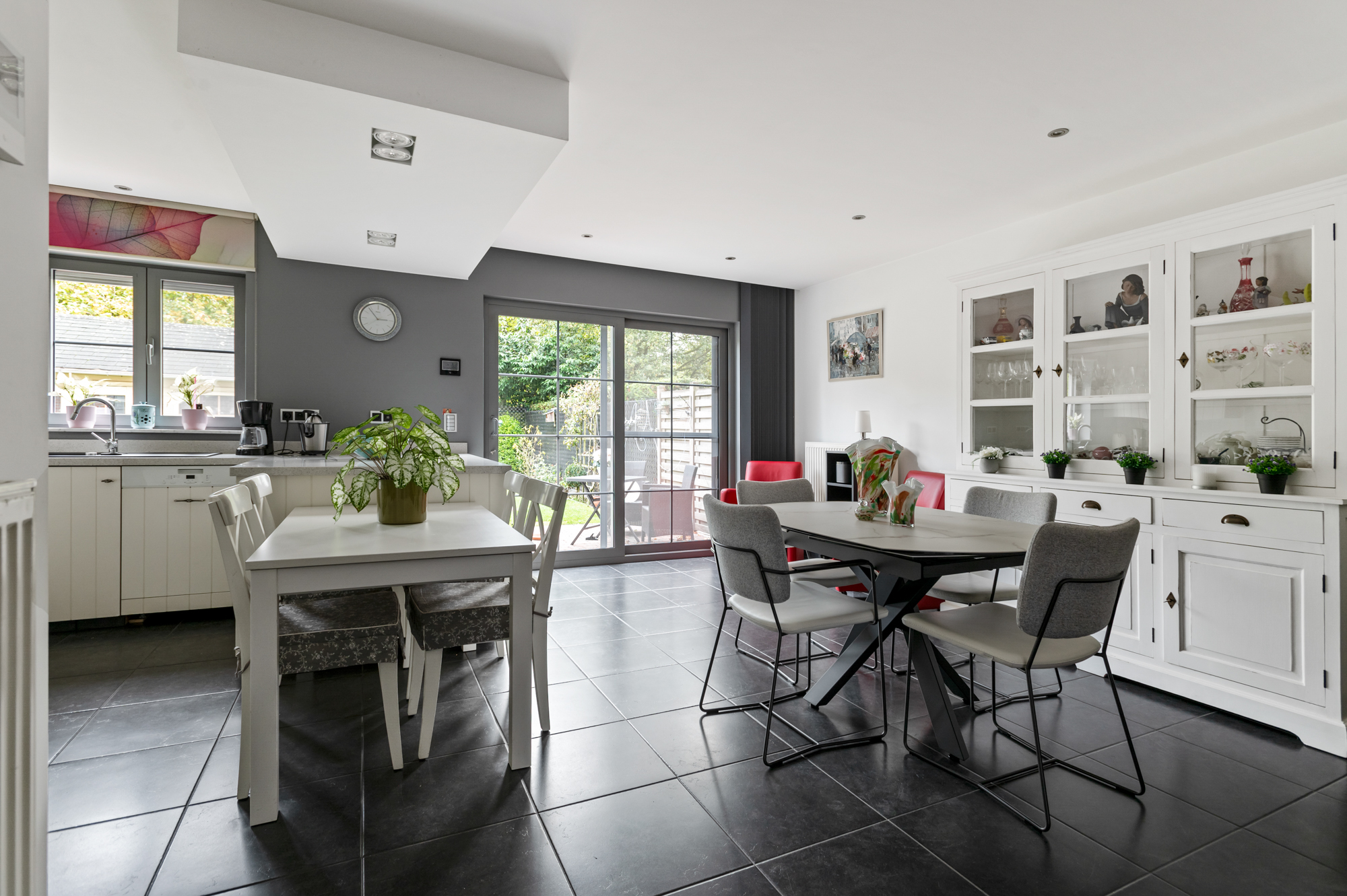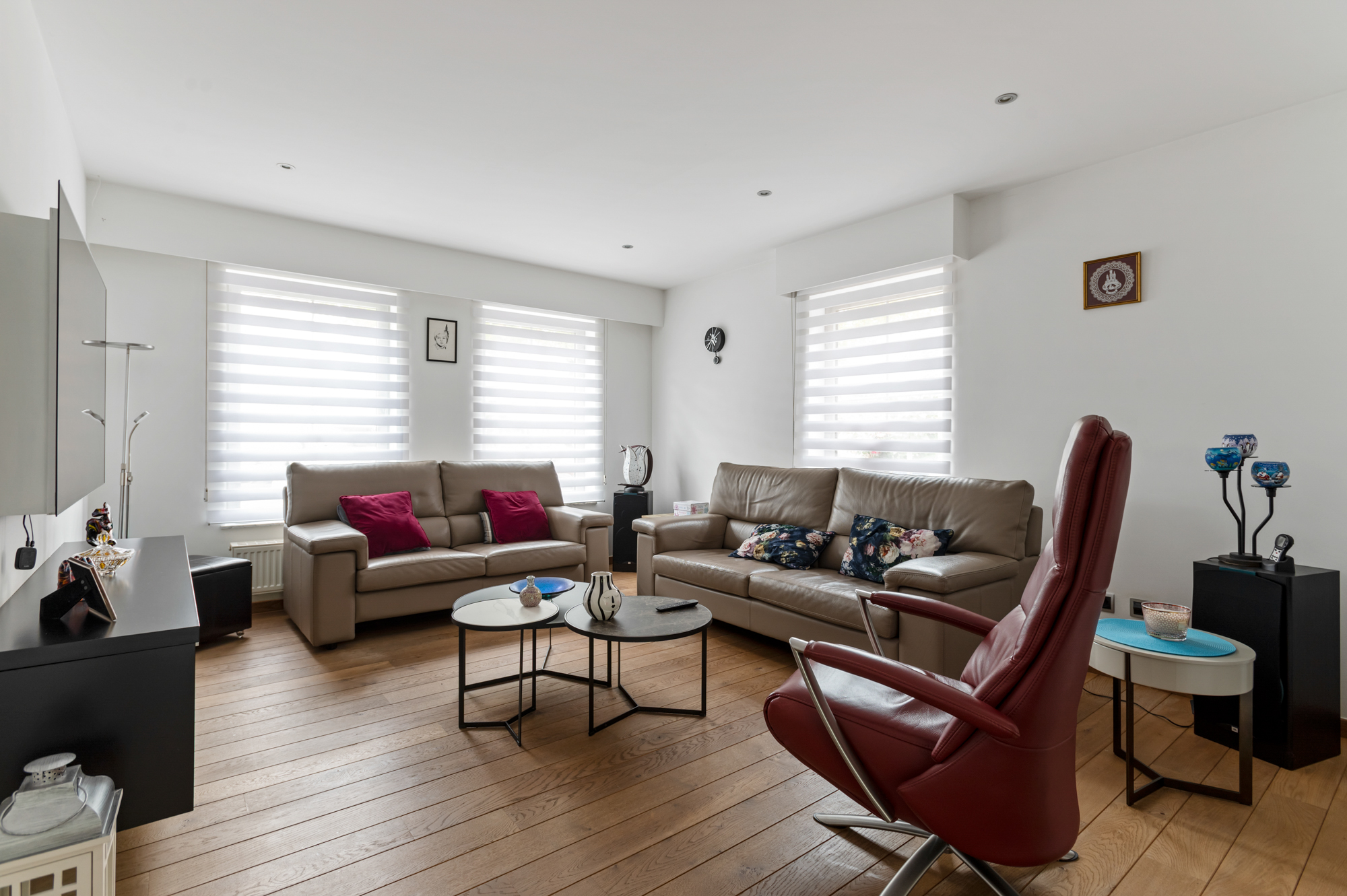 We betreden de woning langs de inkomhal met ingemaakte vestiaire- en schoenenkast en gastentoilet en komen vervolgens in de ruime, lichtrijke leefruimte (met gashaard). De leefruimte biedt U meer dan voldoende plaats voor een gezellige zithoek en een eetkamer.