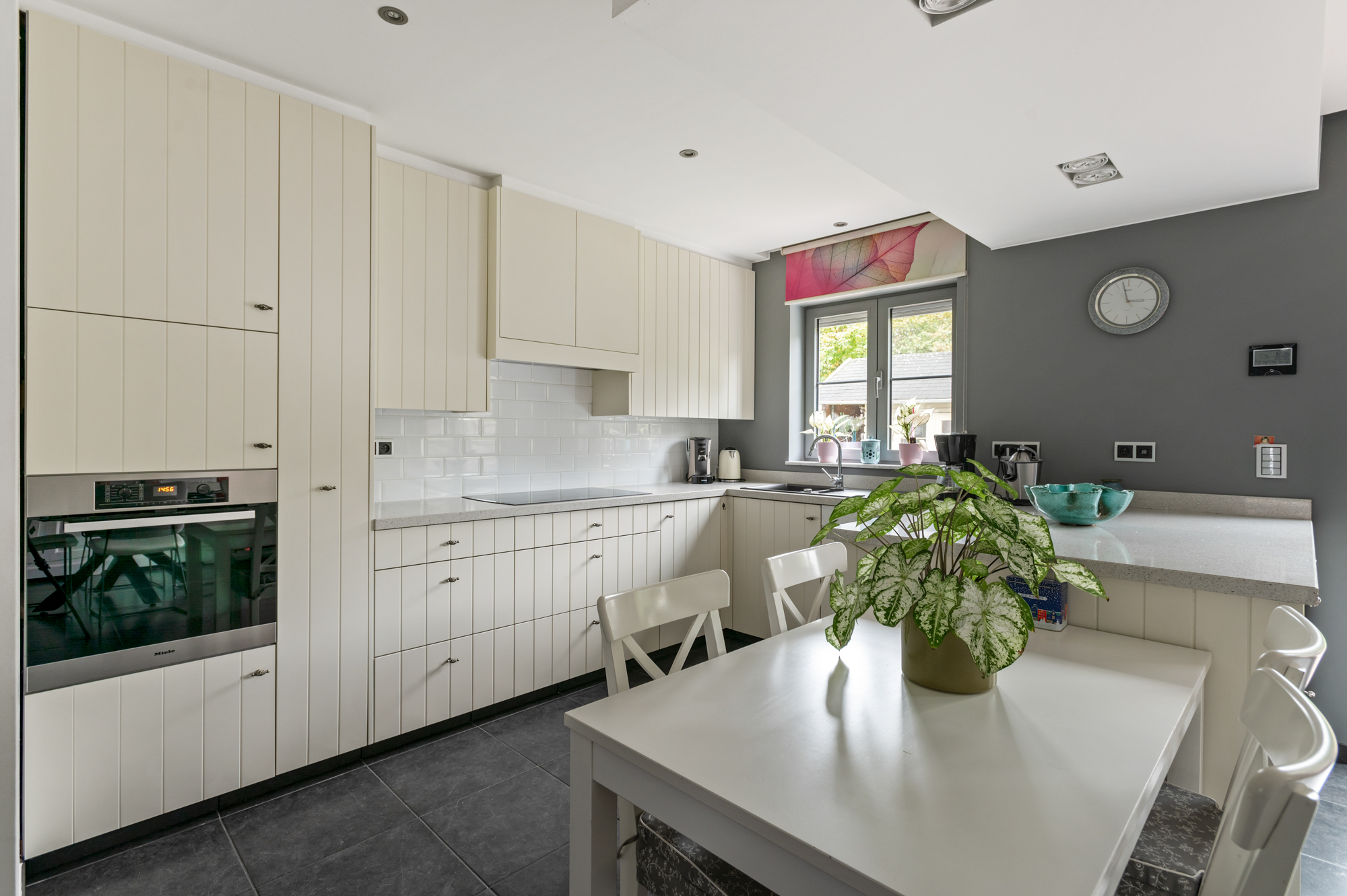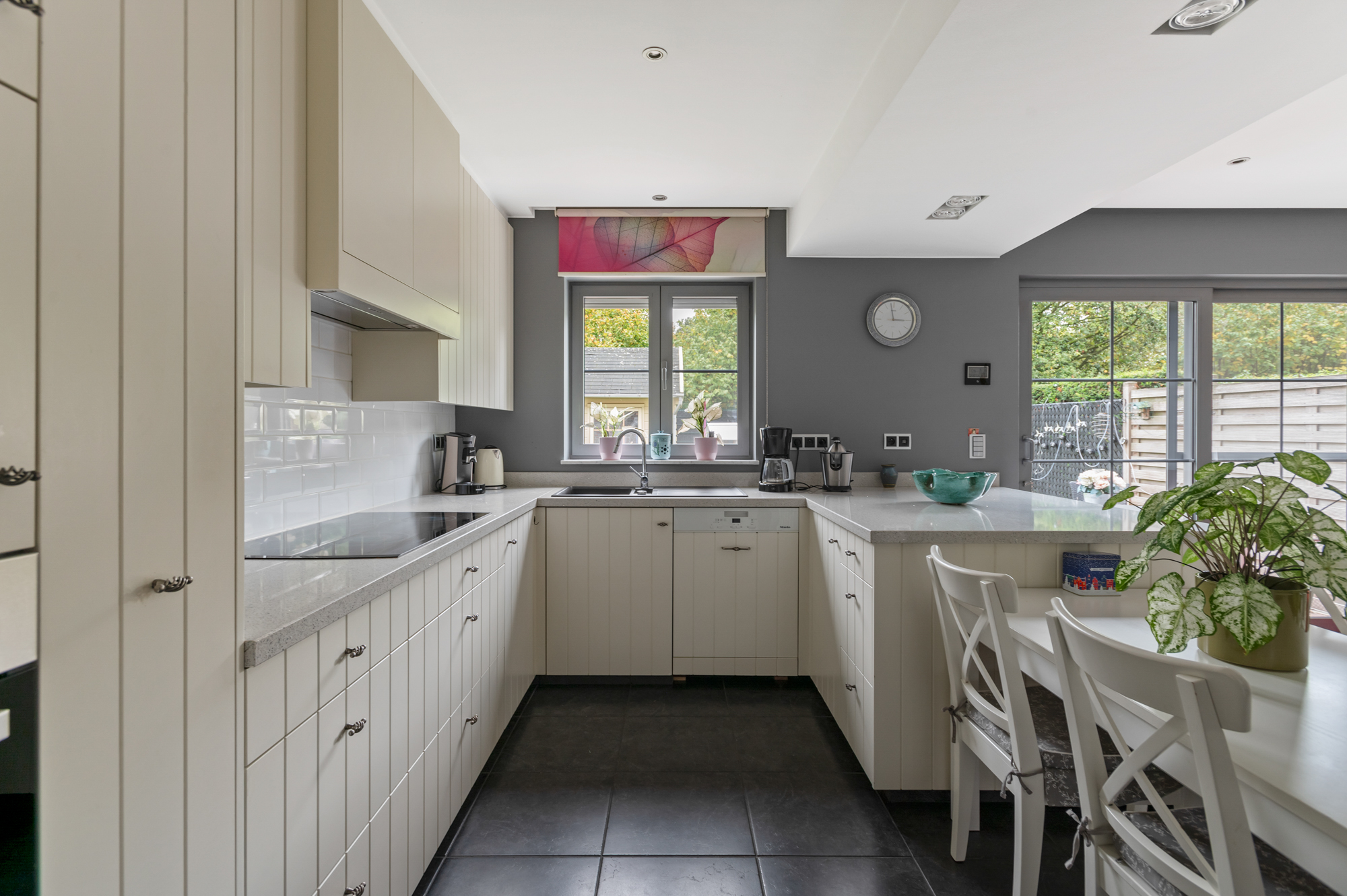 De open keuken (met ontbijthoek) is voorzien van voldoende kast- en werkbladruimte en is verder uitgerust als volgt: kookplaat, dampkap, spoelbak, vaatwasser en oven. Aansluitend aan de keuken vinden we nog een berging met voldoende ruimte voor een koelkast en een diepvriezer. Langs deze berging, kunnen we ook toegang nemen tot de ruime garage, alwaar we ook de voorzieningen voor wasmachine en droogkast terugvinden.