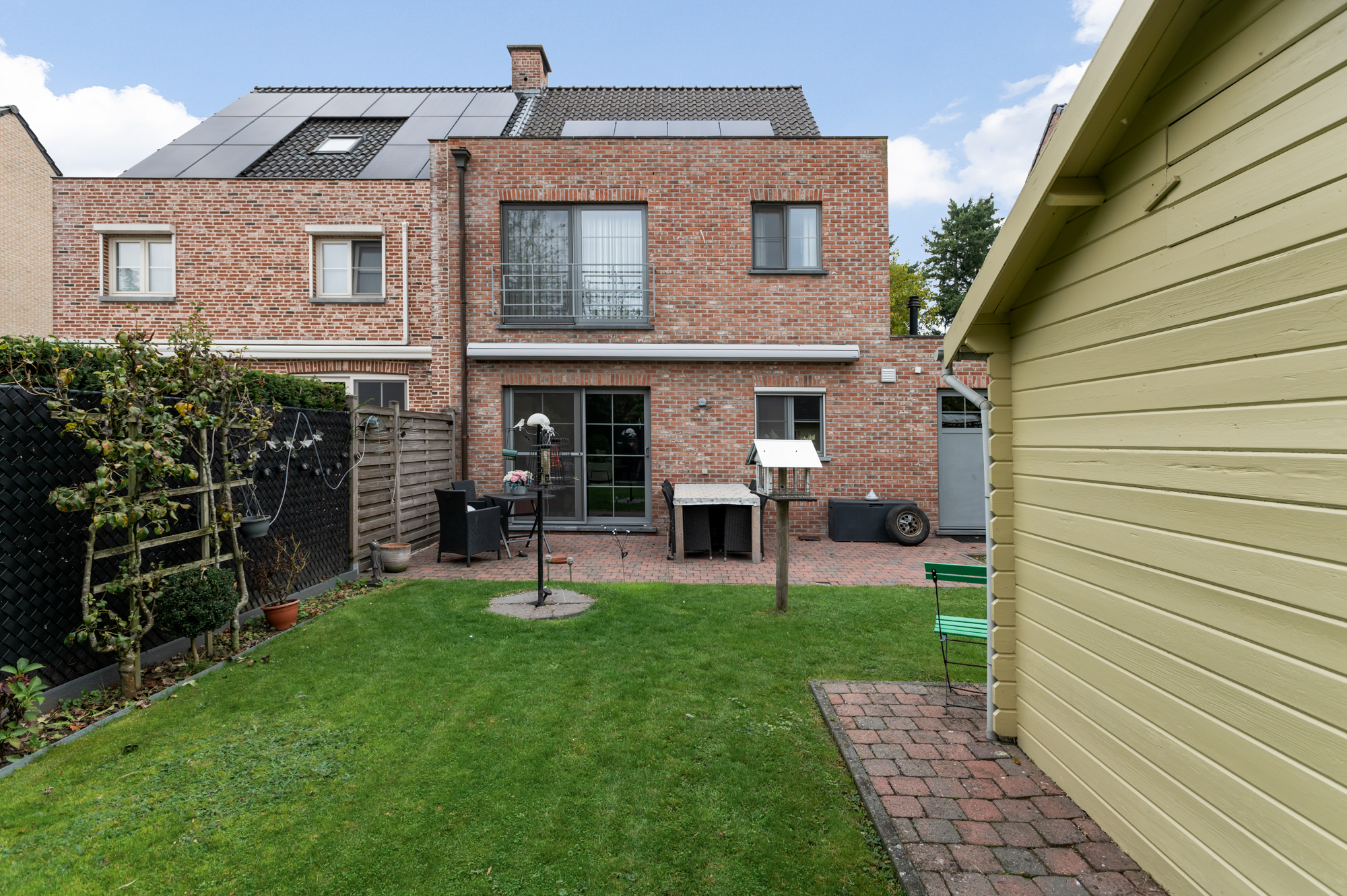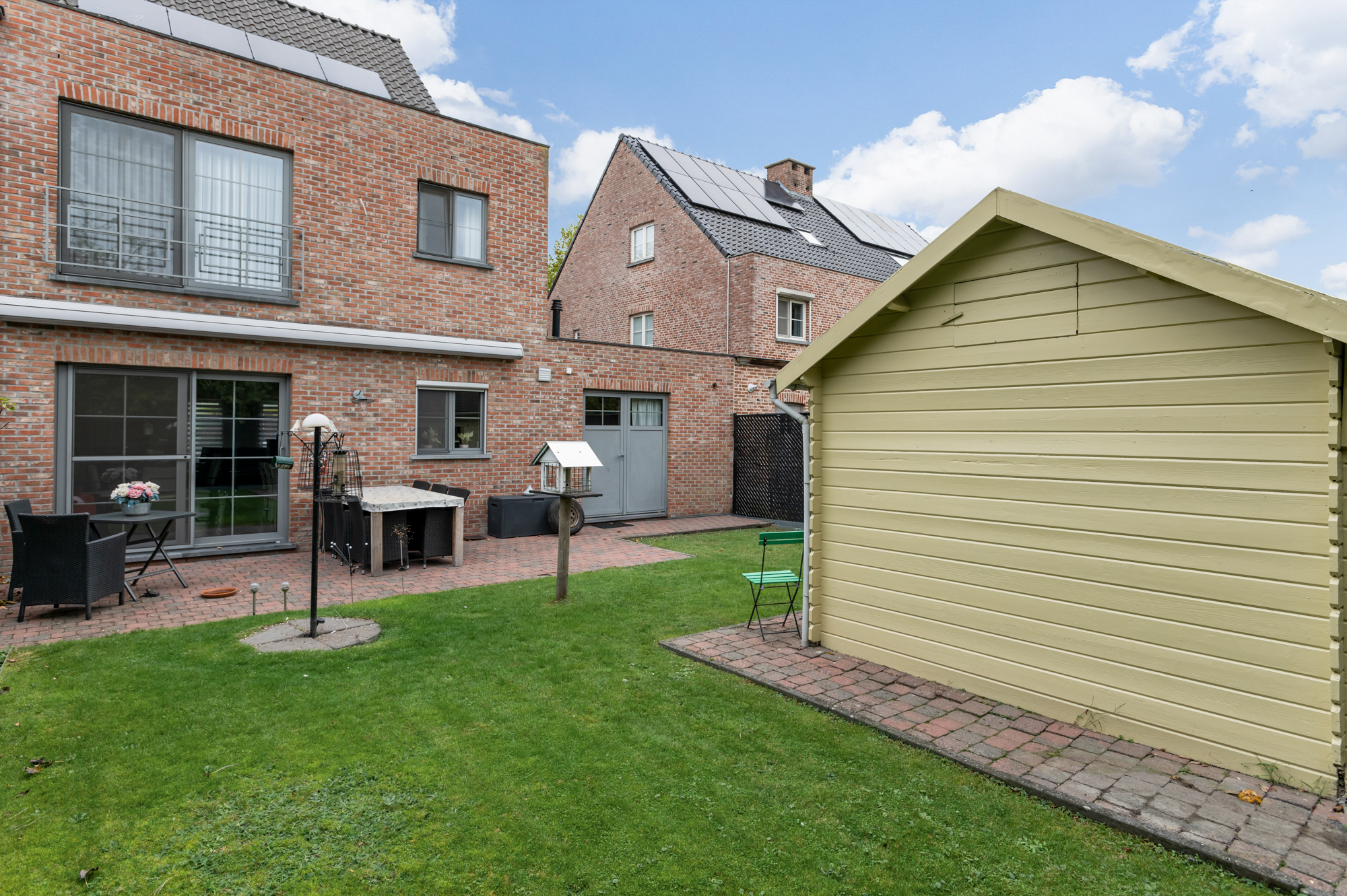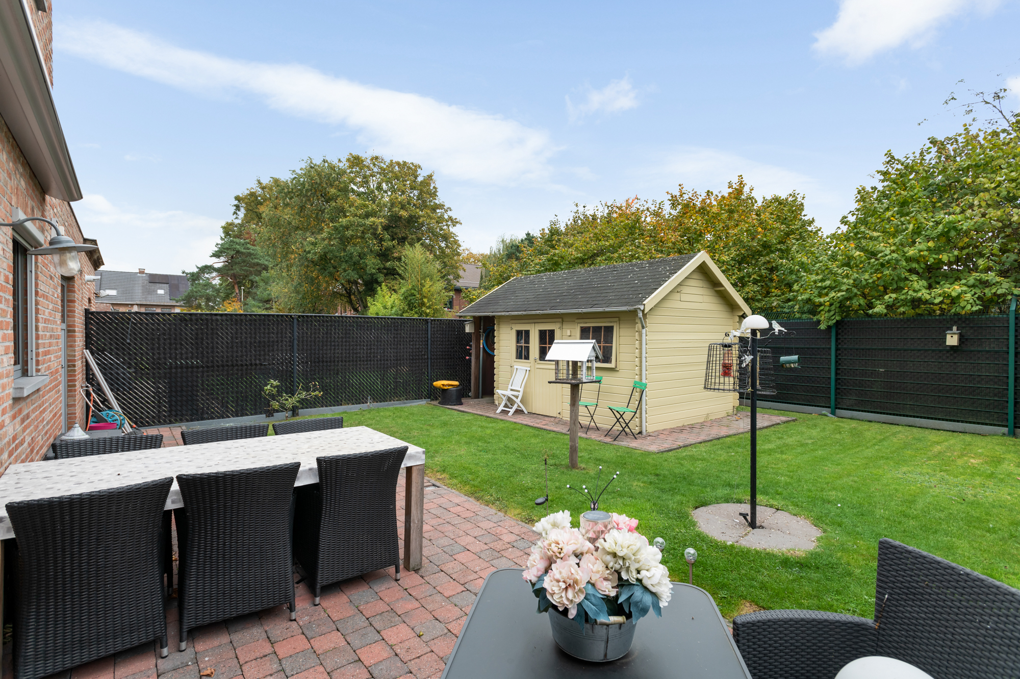 In de tuin met ruim terras (met zonneluifel) is het aangenaam en in alle rust vertoeven met zicht op het groen. Verder vinden we in de tuin ook nog een ruim tuinhuis terug.