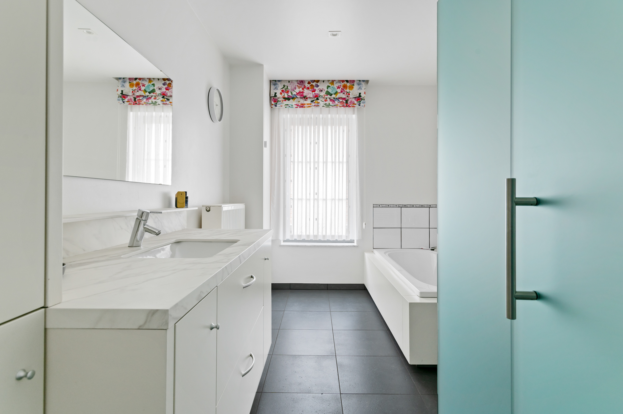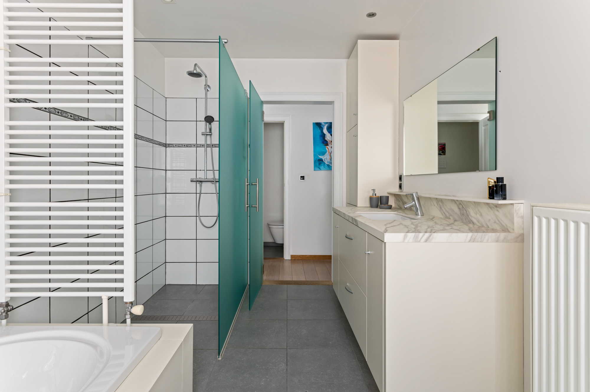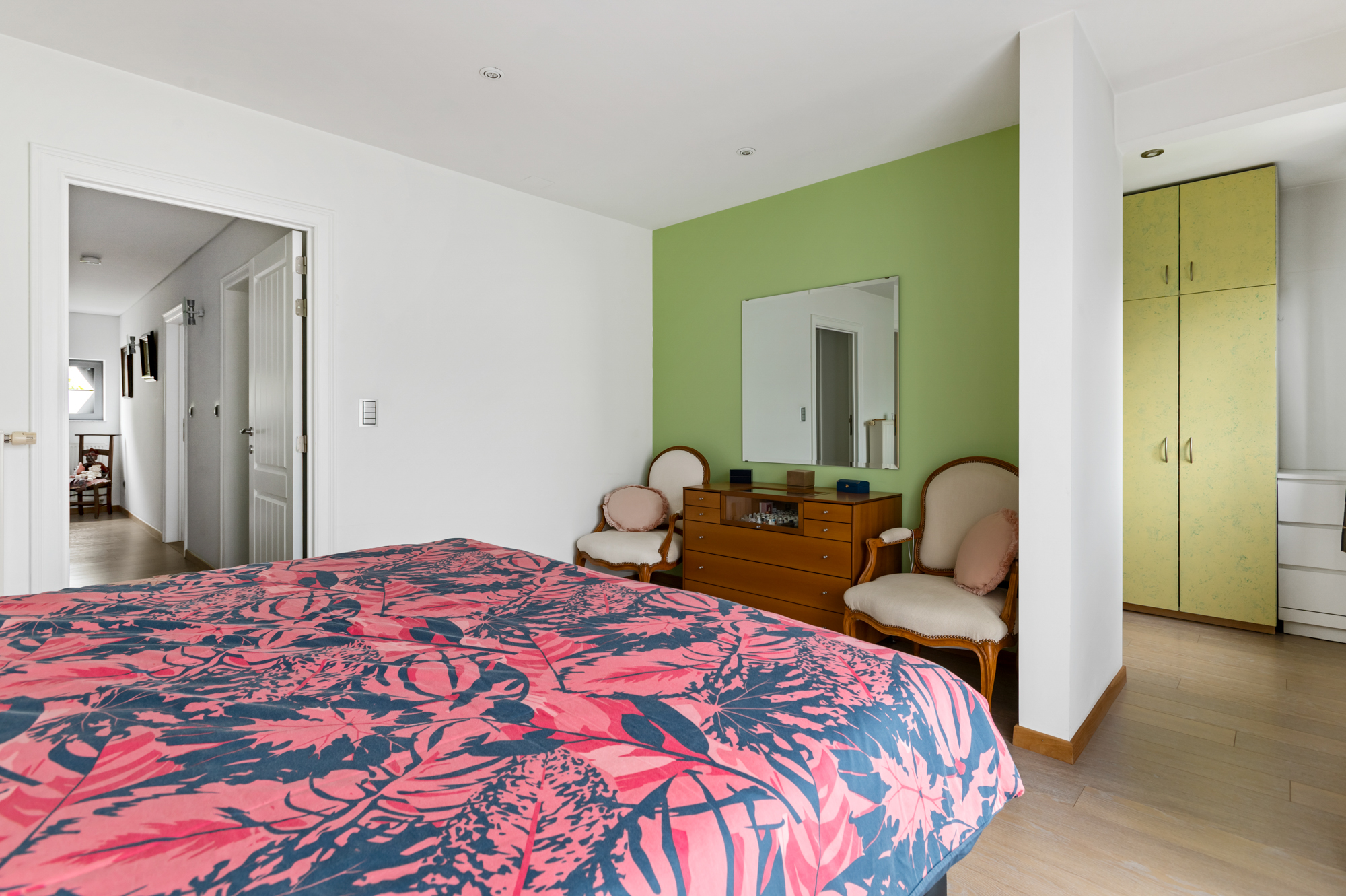 Op de eerste verdieping vinden we naast twee ruime slaapkamers, waarvan één met ingemaakte kast en één met dressing, ook nog een volledig uitgeruste badkamer en een apart toilet. De badkamer is uitgerust als volgt: ligbad, inloopdouche en lavabomeubel.
