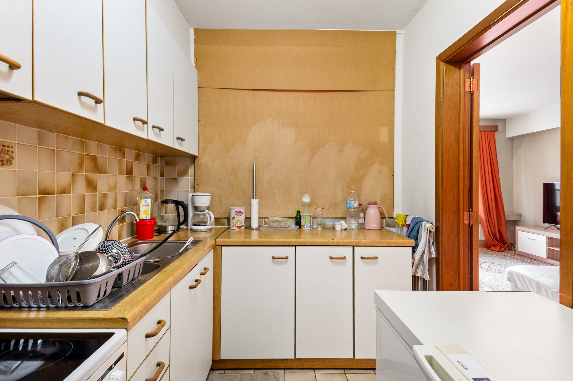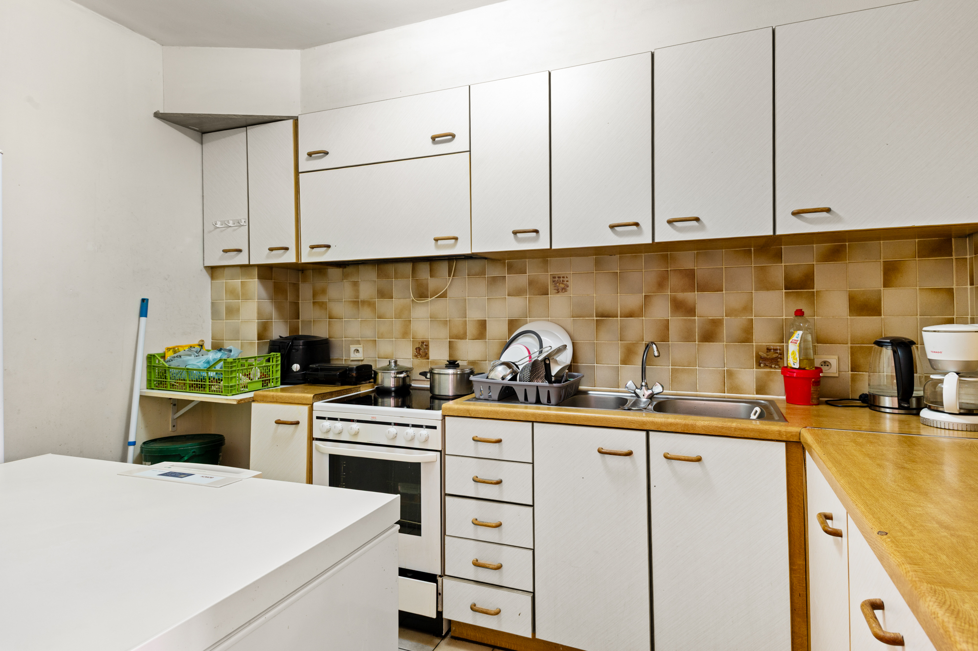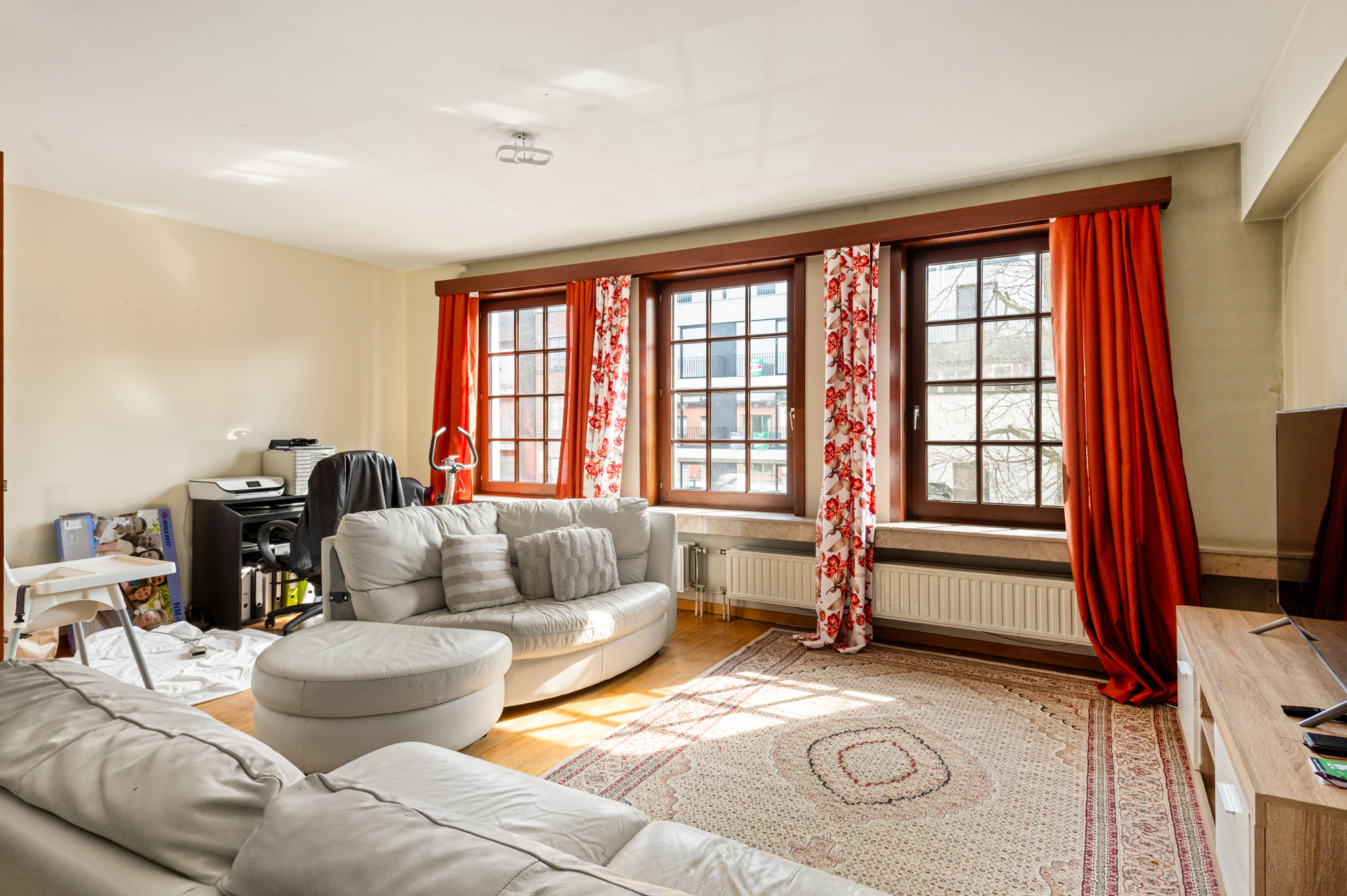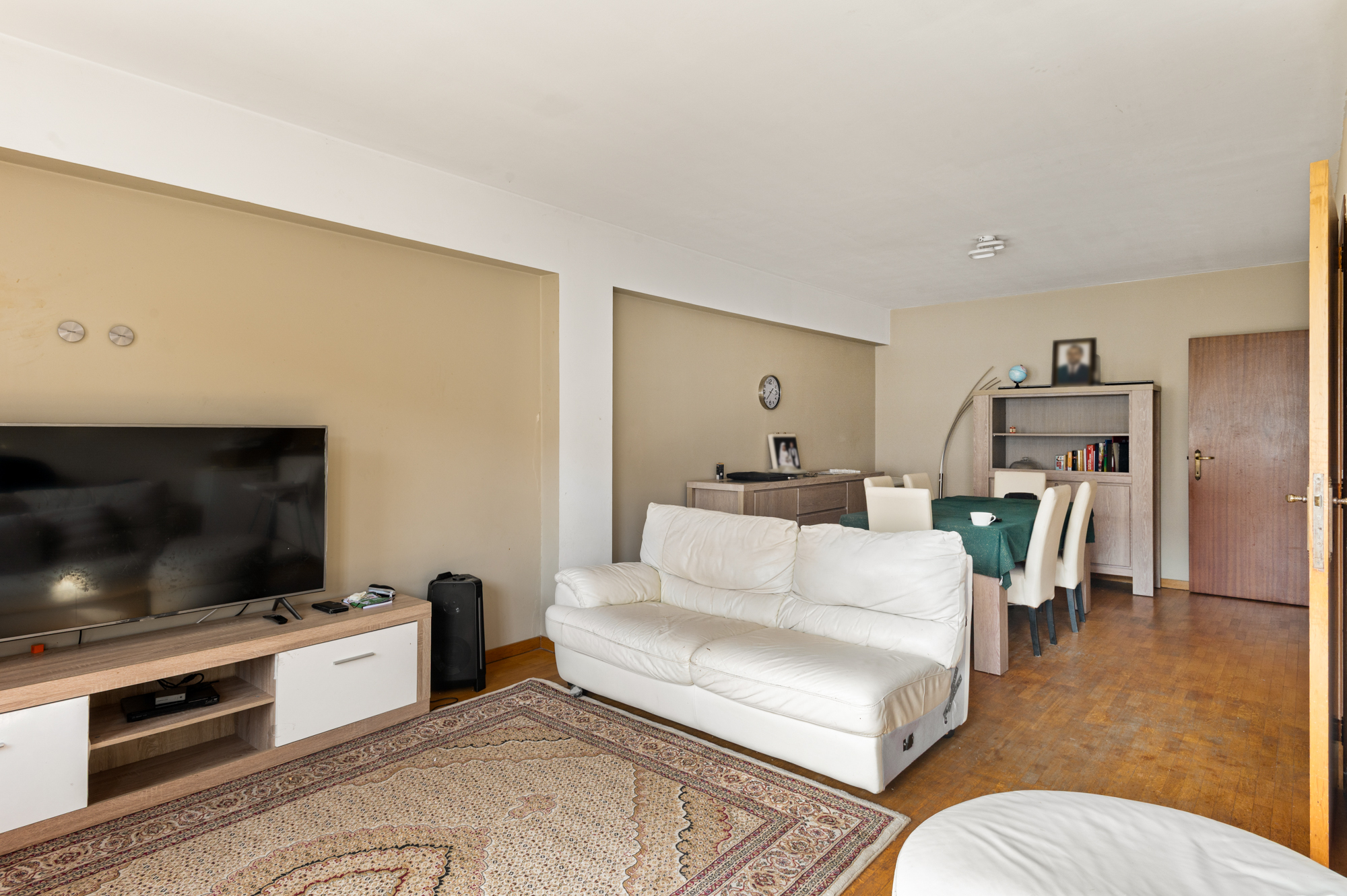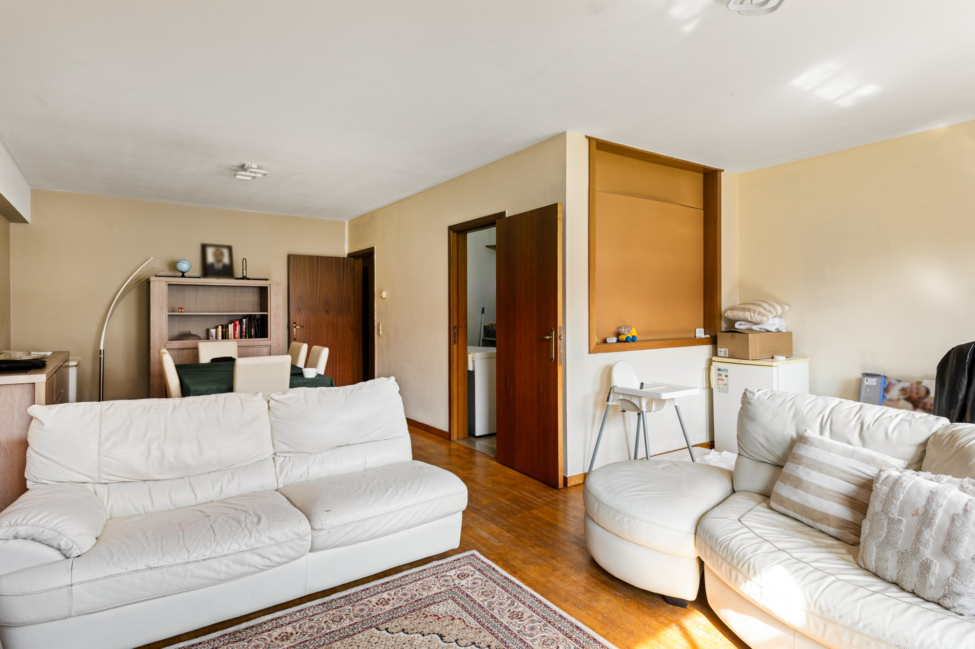 We betreden het appartement langs de inkomhal (met vestiaire en apart toilet), welke onze toegang geeft tot de ruime (35,50m²) en lichtrijke leefruimte. De leefruimte biedt U meer dan voldoende plaats voor zowel een gezellige zithoek als een eetkamer. Aansluitend aan de leefruimte vinden we de keuken, welke beschikt over voldoende werkblad- en kastruimte.