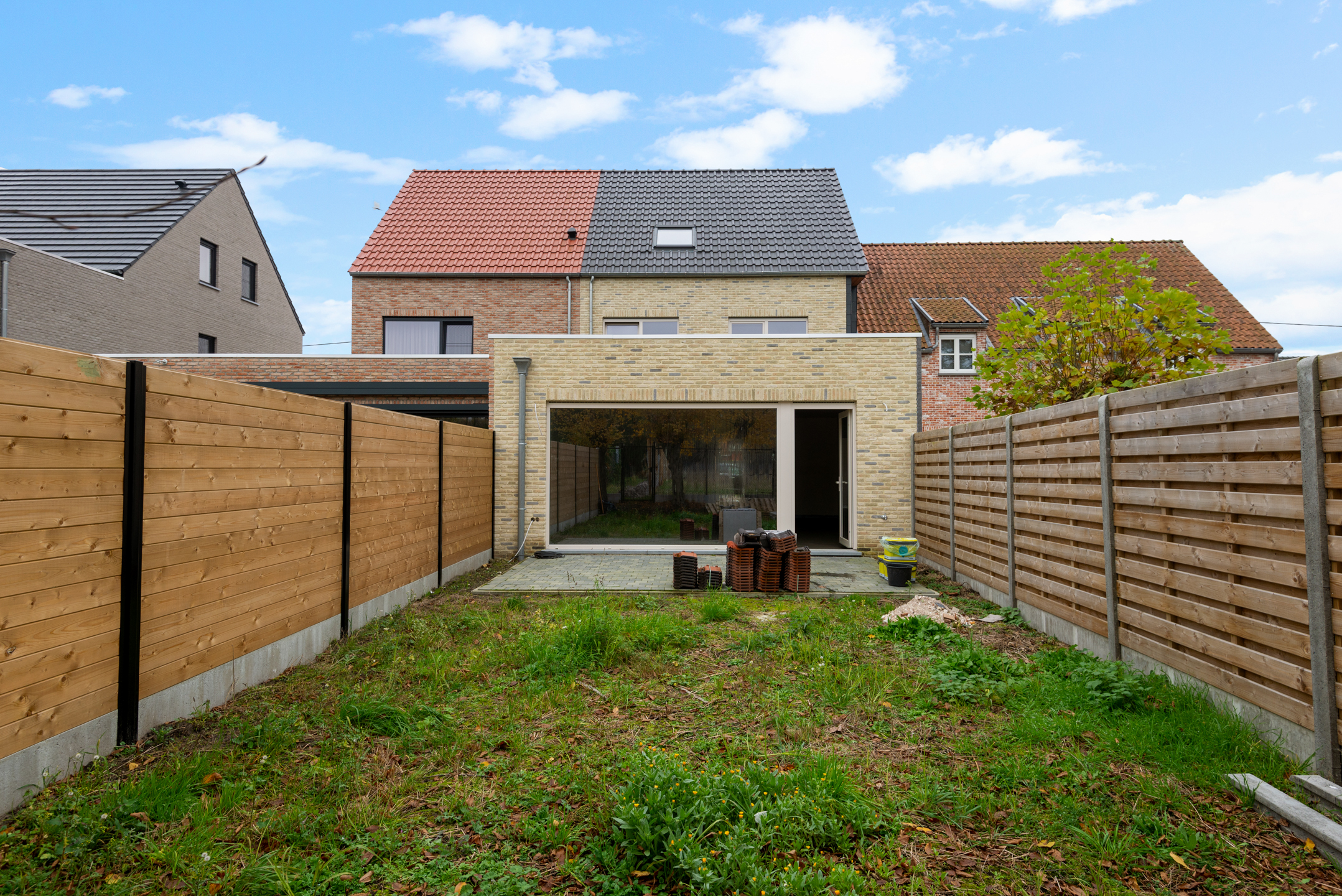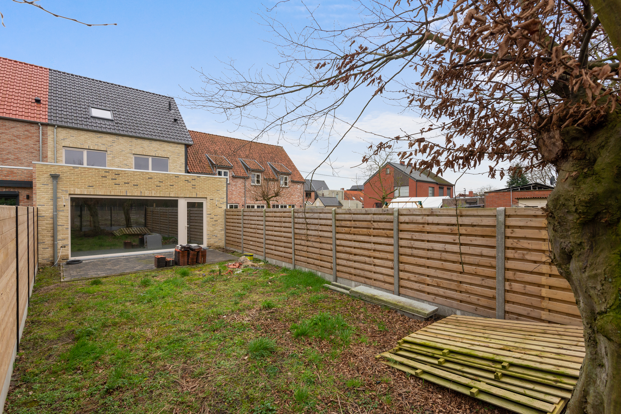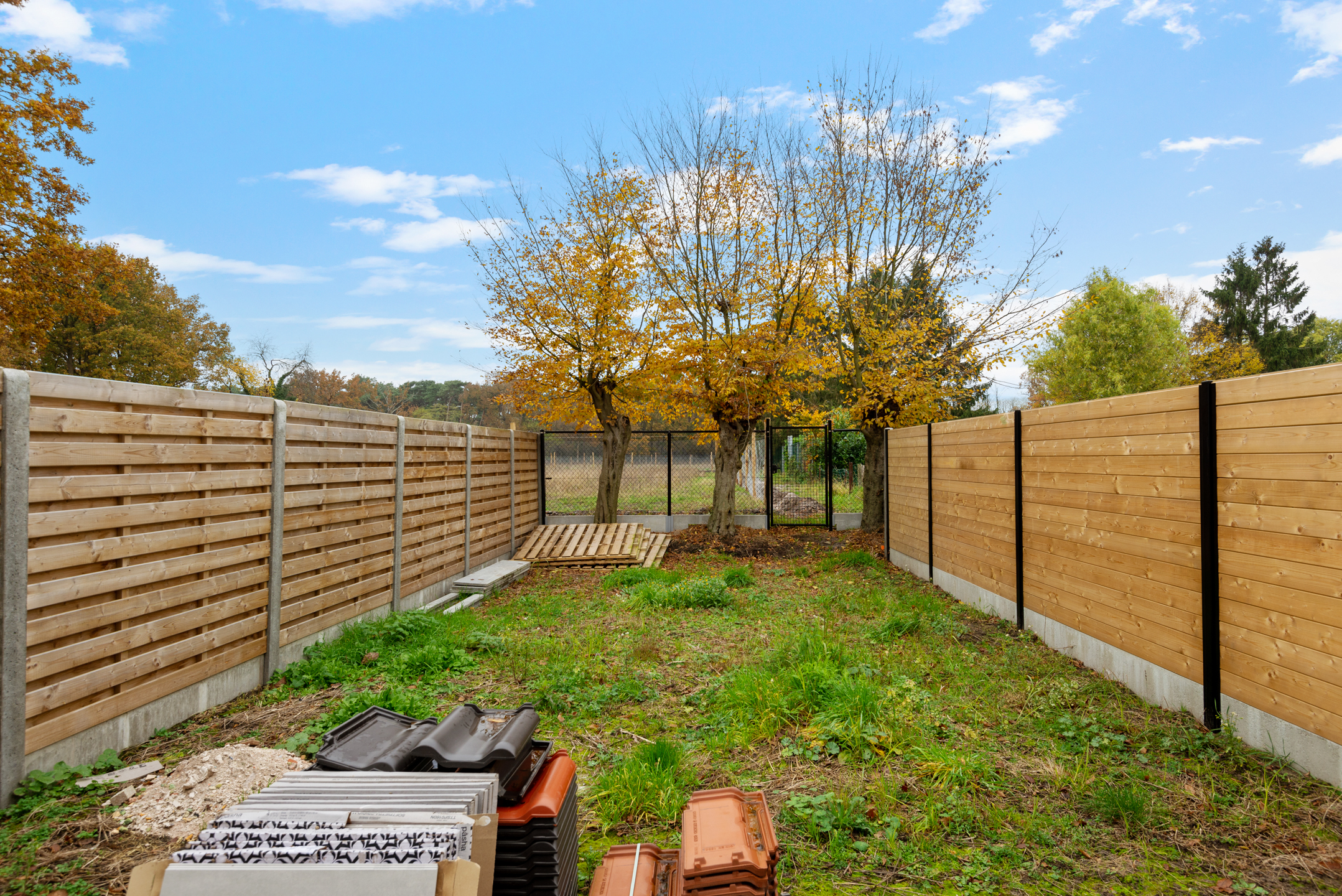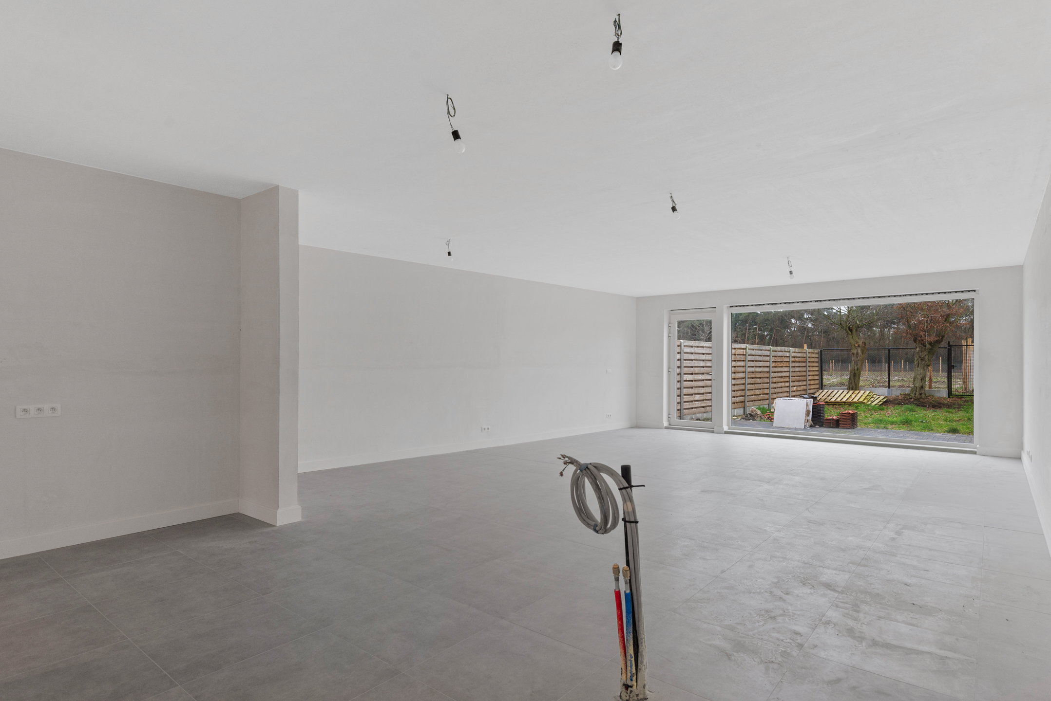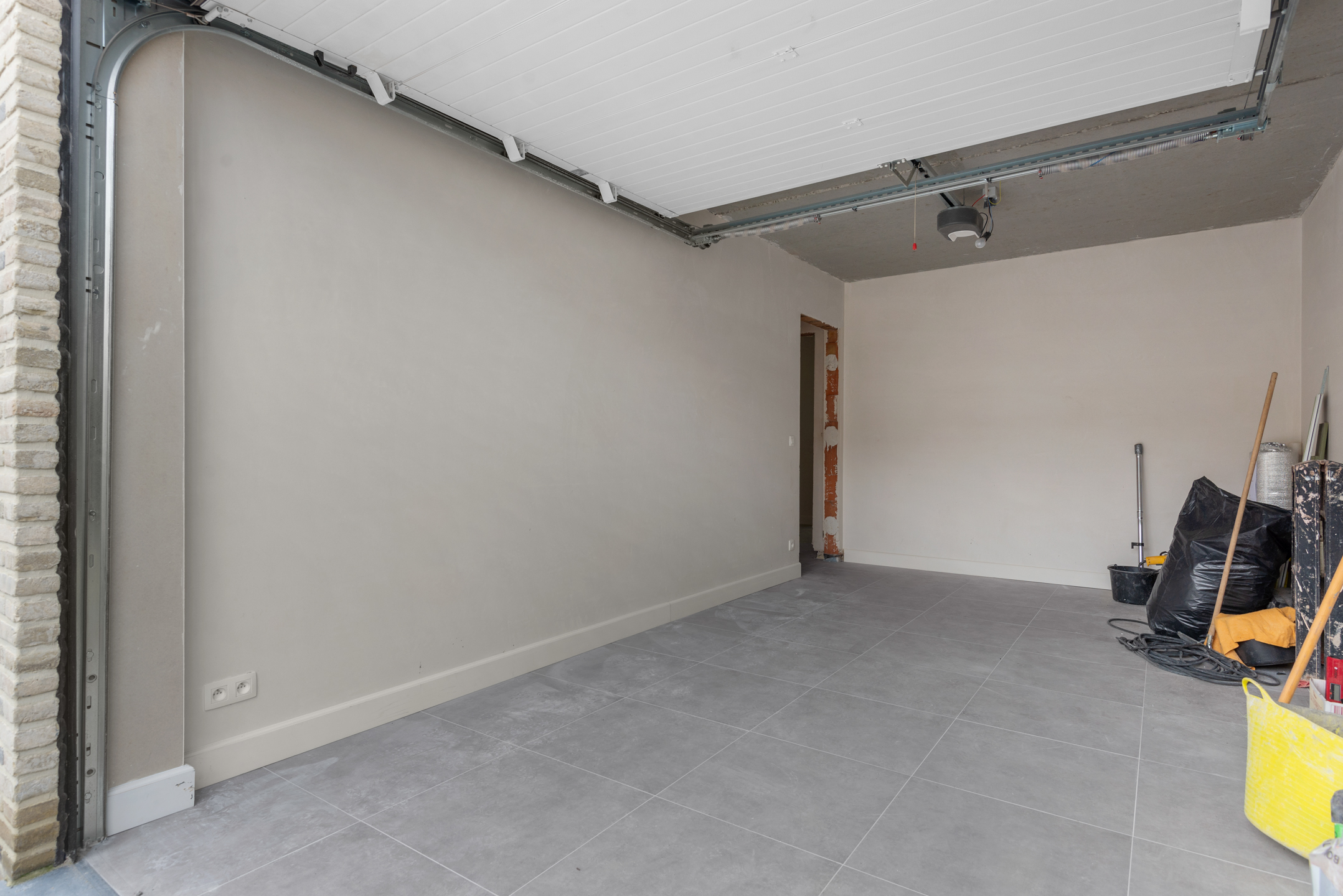 Gelijkvloers krijgen we langs de inkomhal toegang tot de garage (met geautomatiseerde poort), de berging (met aansluitingen voor wasmachine en droogkast), het apart toilet en de ruime leefruimte met open keuken. Achteraan de woning vinden we dan nog de tuin met terras. Achteraan werd een draadafsluiting met poortje voorzien.