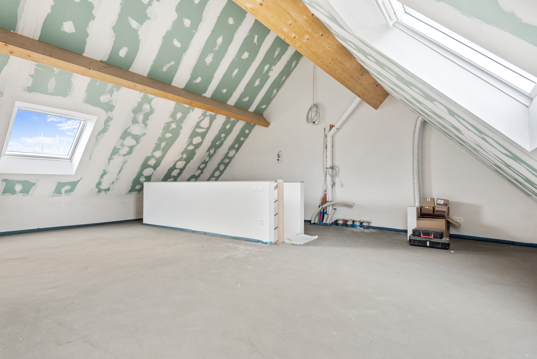 Tenslotte beschikt de woning ook nog over een afgewerkte zolderverdieping (met twee veluxramen), alwaar de nutsvoorzieningen reeds toekomen. Deze zolderverdieping kan dan later door de koper zelf ingericht worden naar keuze. Hier heeft men de mogelijkheid om nog twee bijkomende slaapkamers en een extra badkamer te creëren.